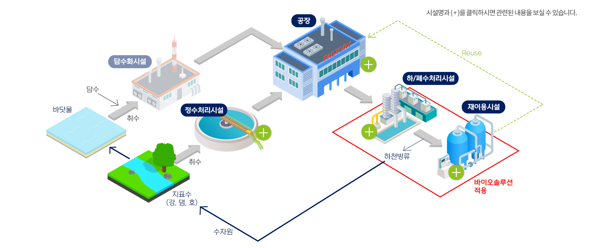 | 바이오솔루션 | 물 속의 유기물과 질소, 인을 생화학적으로 처리할 수 있도록 고객 현장에 적합한 영양원, 효소, 특정 미생물을 공급 | 제품바로가기 | |